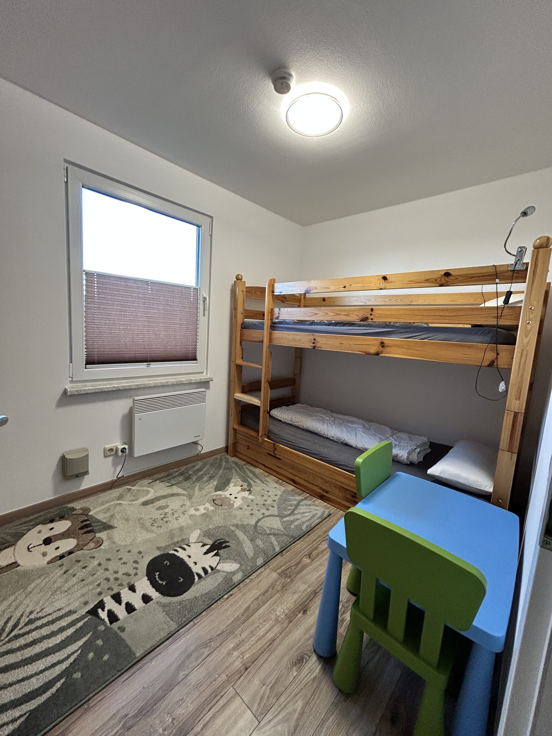 1 Hochbett 2 Personen (90x 200 cm) + 1 Aufbettung – Ausziehbett(80 x 200 cm), Bettwäsche, Kleiderschrank, Elektroheizkörper, Laminat/Teppich, Hochstuhl für kleine Kinder, Kindertisch mit zwei Stühlen